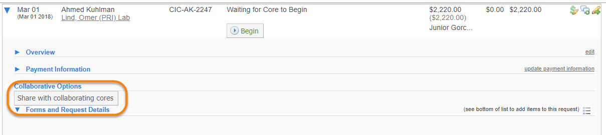 To see the addition of collaborating cores in your site, you will need to navigate to the View All Requests tab and expand an existing project using the blue triangle on the left hand side. You will see a new section that displays under “Payment Information” that shows “Collaborative Options".