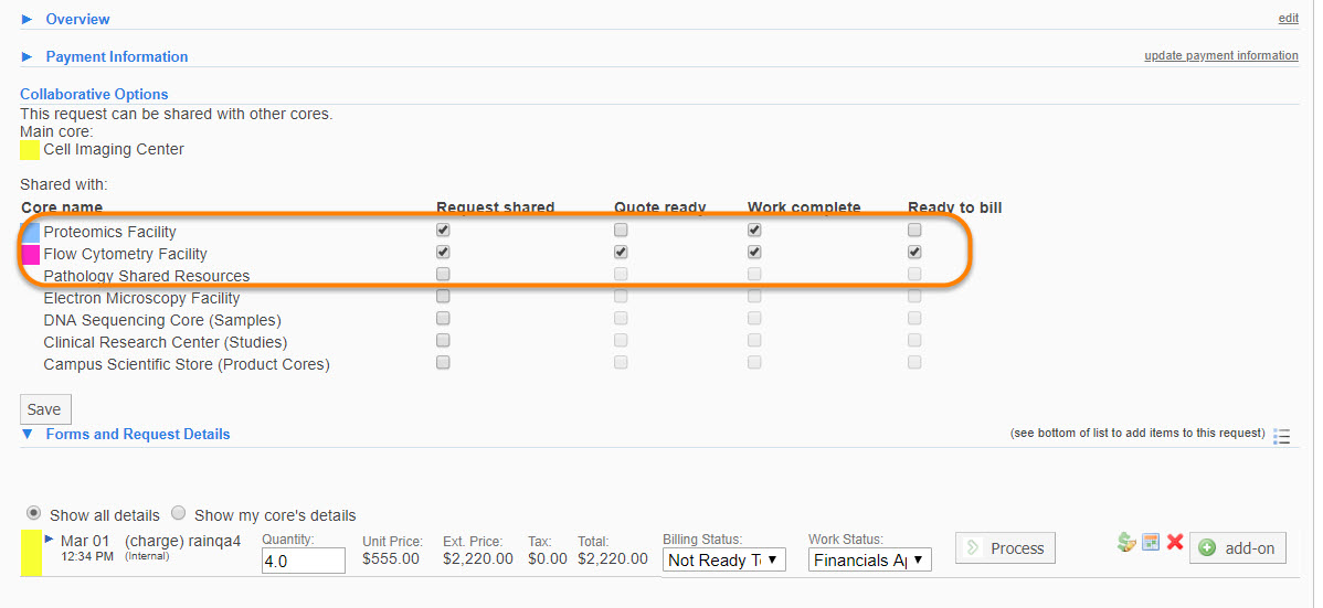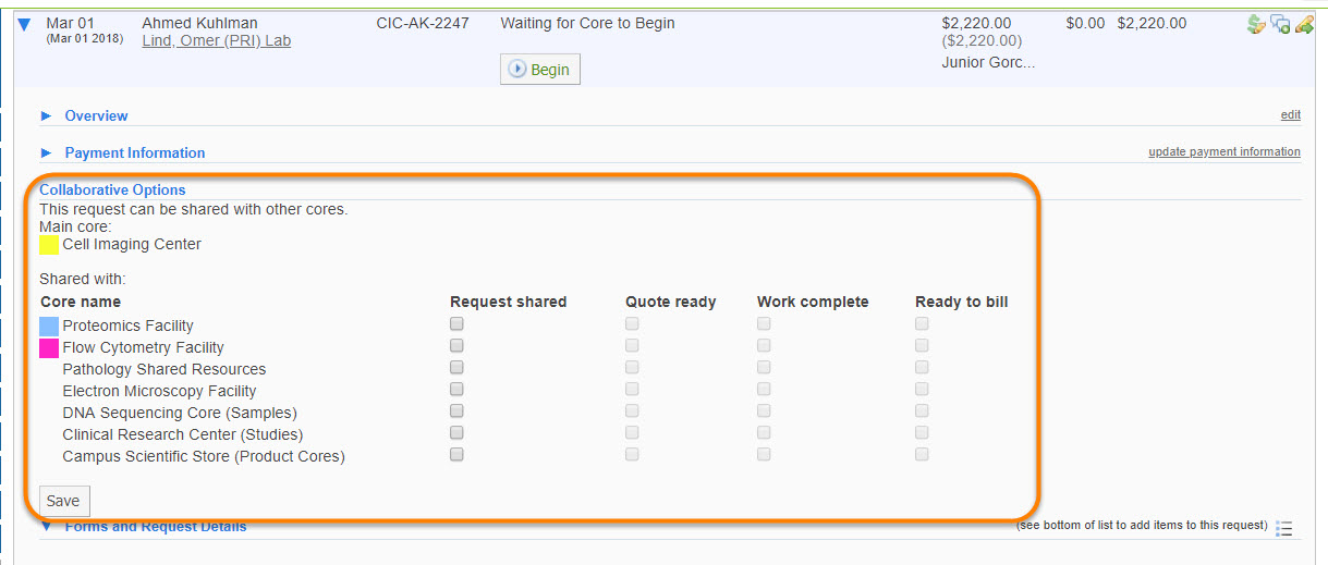 Collaborating Cores is a function that allows cores to share an individual requester's project request among one or more cores. When shared from the parent core, each core is able to add, edit, complete and delete their own services from the project request. Cores are also able to bill for their own services no matter which core the project originated it. By default, the parent core is the only core able to complete the project request as a whole.