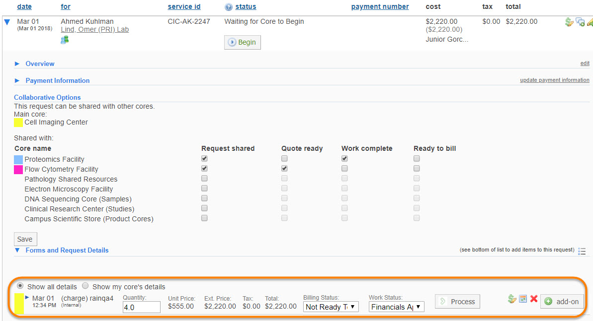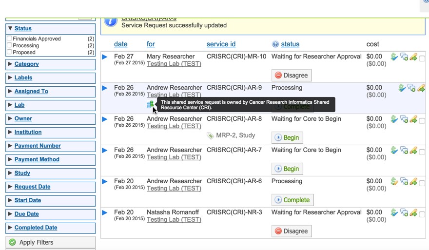 You’ll notice now that a new icon displays next to the collaborative project. You can see who the originating core is by hovering over this icon, as well as by referencing the Service ID. The project will now show on the View All Requests tab for all collaborating cores.