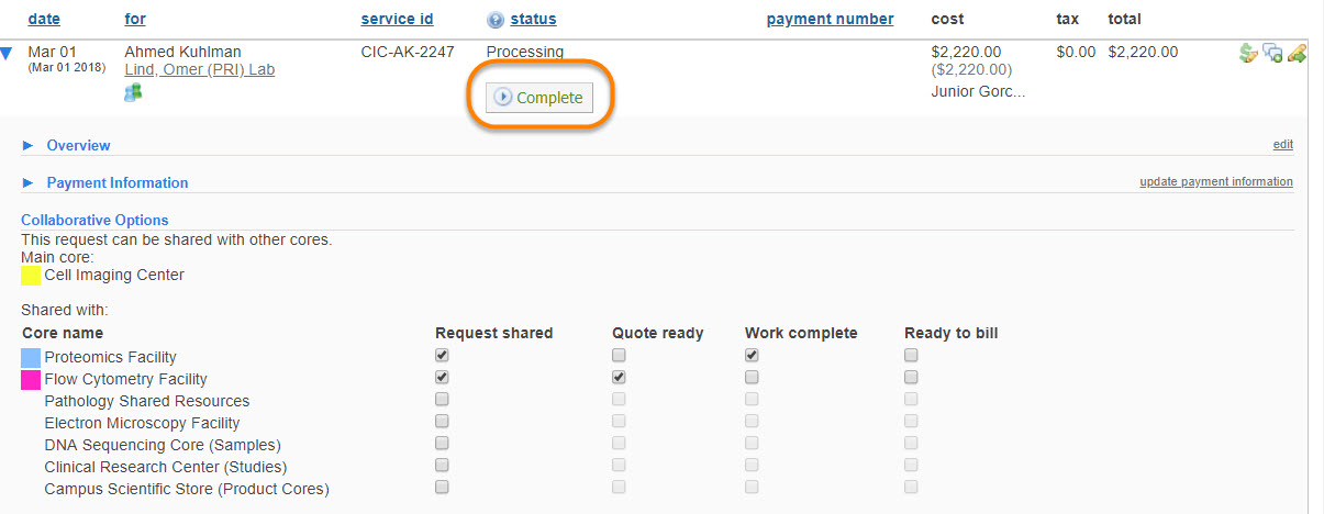 Once all of the collaborating cores have marked on the status table that their portion of the collaborative workflow has reached the “Ready to Bill” status, the final step in the process is to have the originating core close and complete the project.