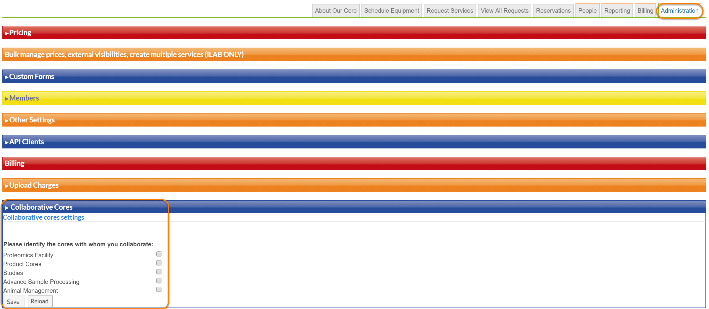 If enabled as the institutional level, you will be able to access the Collaborative Cores settings on the under the core’s Administration tab, where you can indicate which cores you want to collaborate with: