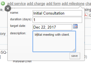 Navigate to your service request, then click on the blue arrow to expand the service request view. Below all charges and forms will be the "add milestone" link, click on the link.