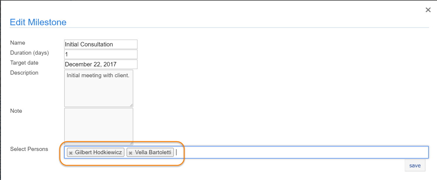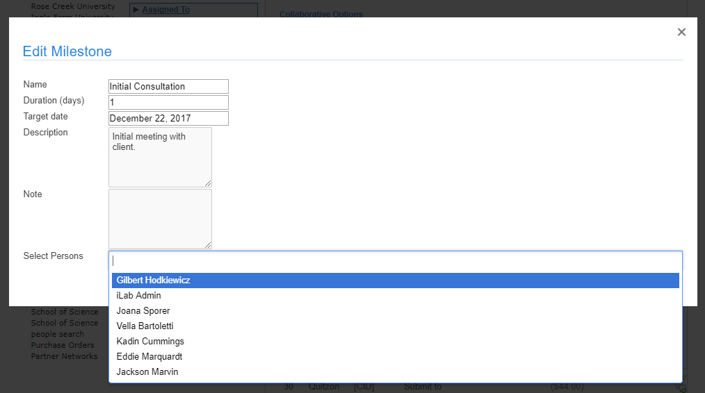 The editing window will open, allowing you to assign a core staff member by clicking inside the "Select Persons" box. A list of core members will populate in the drop down. To select a user, click on the name. You may assign multiple members to a single milestone. (NOTE: The pencil icon will not become active until the status is changed to "Started" or "Finished".)