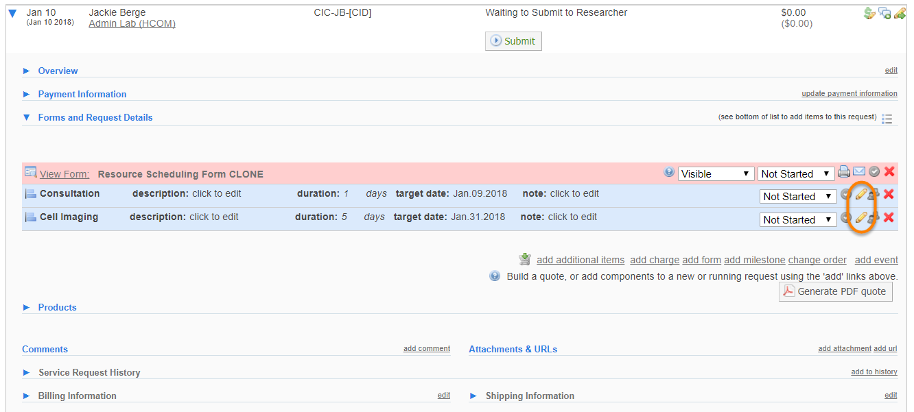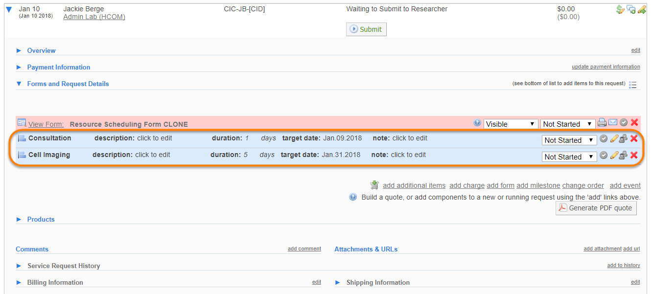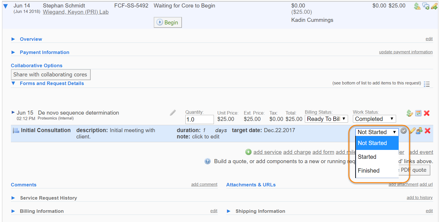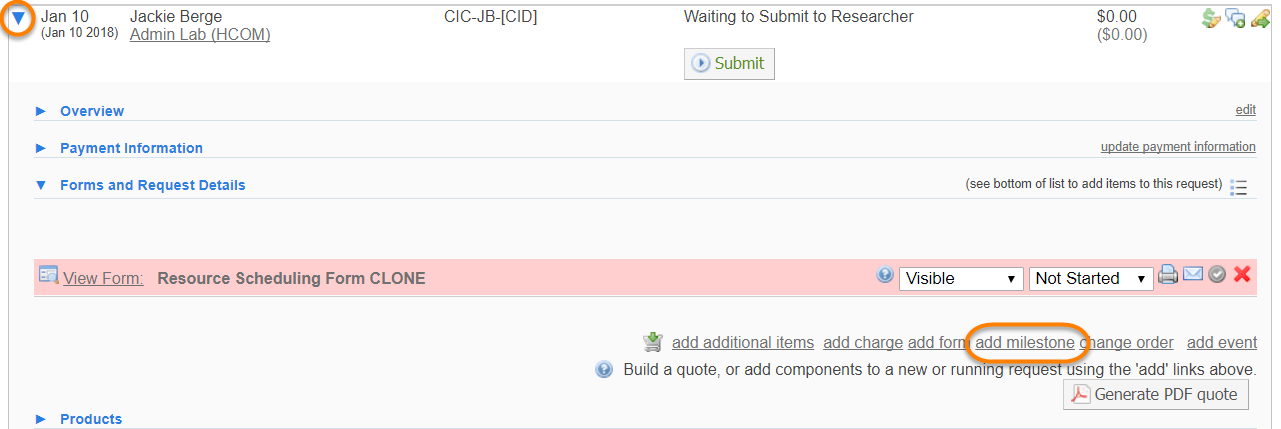 A milestone is a project management tool used to mark a stage of development within a project. Milestones can be assigned to core staff members and can contain information specific to this project. iLab Milestones are visible to both core staff and customer, allowing both sides to see the progress of the project. Additionally, auto-generated emails can be set for core staff to see when one milestone has been completed and another needs to start. To assign milestones, begin by accessing an individual service request on your View All Requests tab.