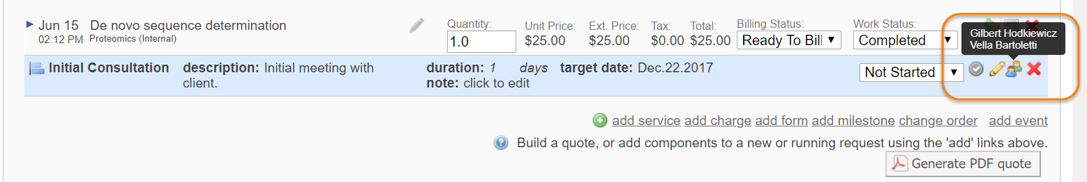 Once a milestone has been added, you have the ability to assign core staff members from the View All Requests tab to the milestone by clicking on the yellow pencil icon.