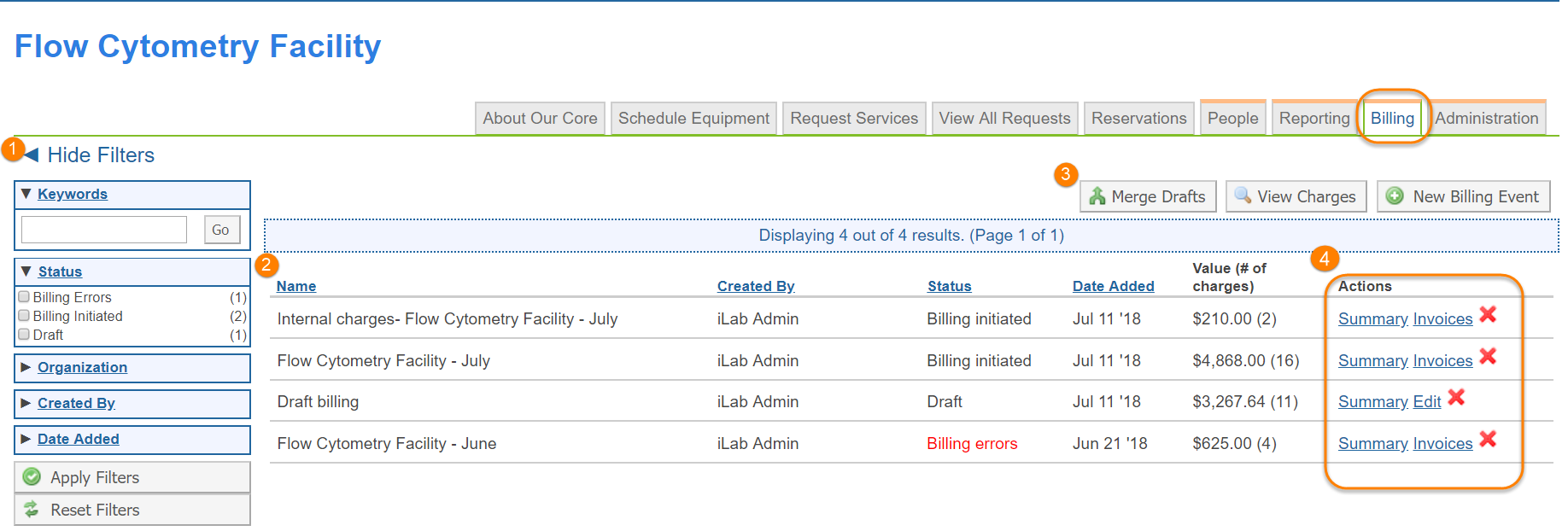 As a core administrator, you will be able to bill your customer for all charges in iLab. All billing occurs from the Billing Tab and is only available to core administrators. You can review charges, create a new billing event, and manage invoices. The Billing tab is accessed from your core's homepage. The iLab billing module is flexible, meaning that you can bill as frequently as you would like and you can include or exclude any charges. Depending on the integration at your institution, iLab's billing feature can ensure customers are including payment information and using valid, up to date funds. Billing workflow depends largely on the institution and may differ slightly from this help site.