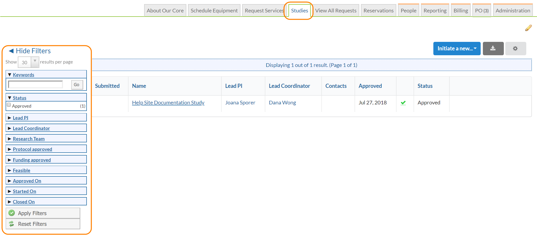 Once a study has been submitted (by facility staff or customer), the core facility can review the information provided, move the study through a variety of states, and approve and customize the study such that it is tailored to help meet the needs of the particular study.