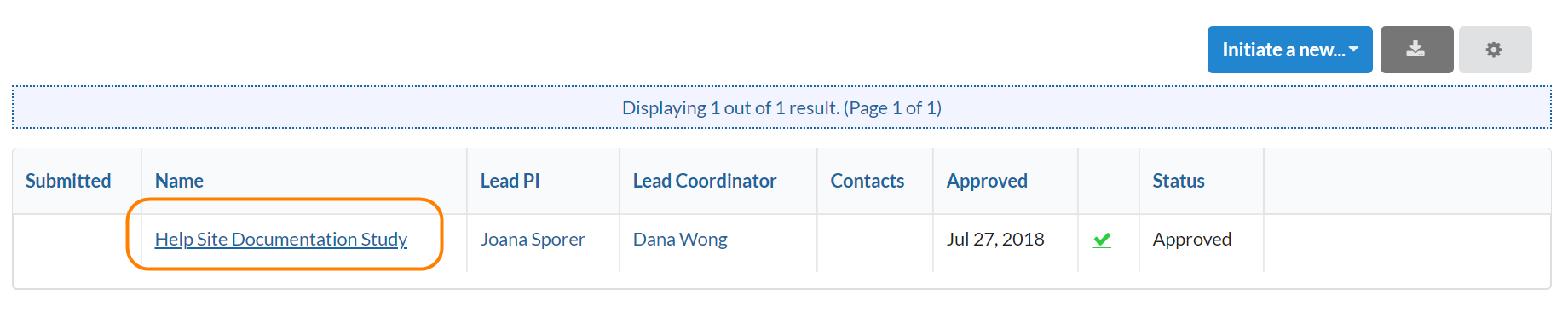 The Studies tab displays a searchable list of active studies. By default, studies are sorted in the order in which they are submitted. For quick reference, high level information is listed for each study in the list view, such as study name, lead PI and contacts, critical dates, and approval status. Basic information is provided for quick access on this summary view. Use the keyword search or the filters on the left side to find a specific study. Click a study name to open the study details for review.