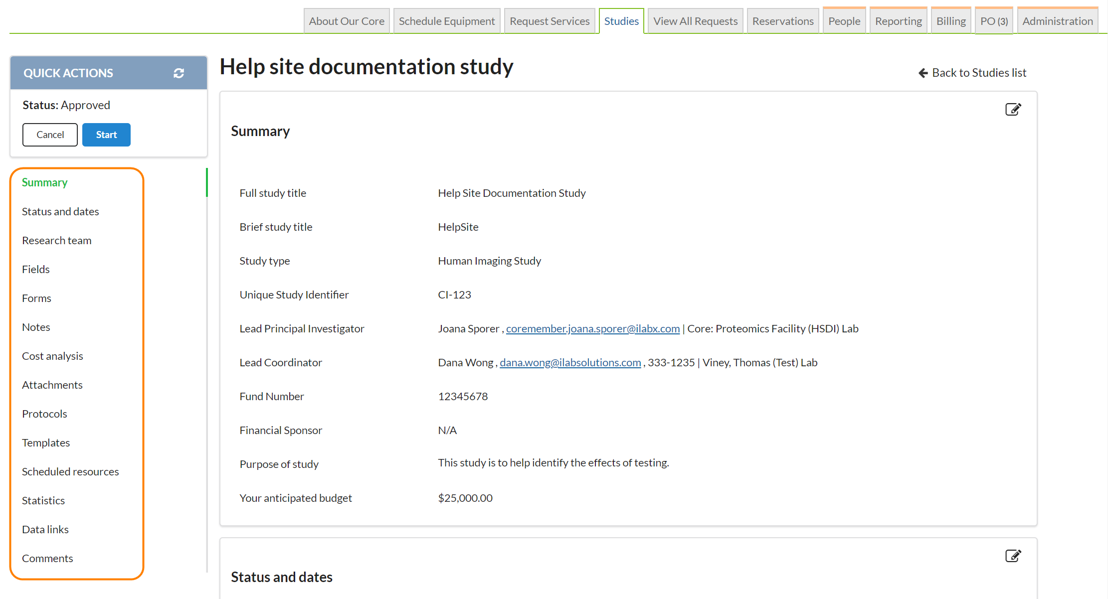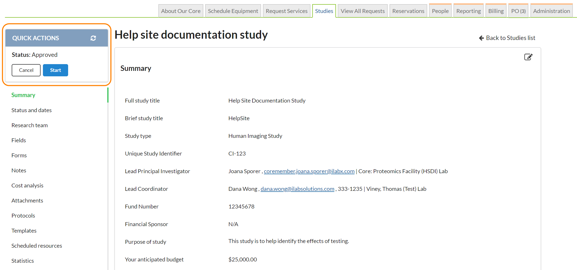 Use the Quick Actions in the left menu to reload the study, update the study to the next state (Core staff only), or initiate a visit or request for the study. Click on a section in the left menu to jump to that section.