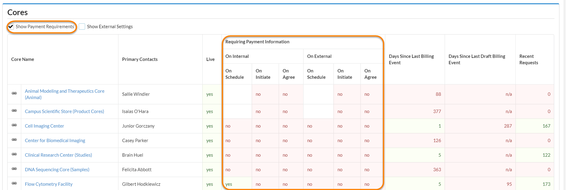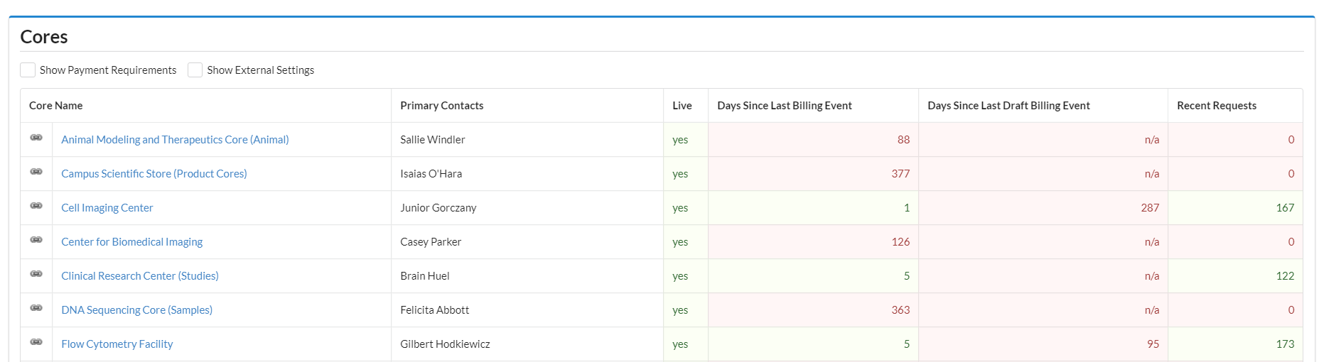 You may also display additional information about the cores by clicking on the boxes, Show Payment Requirements and Show External Settings.