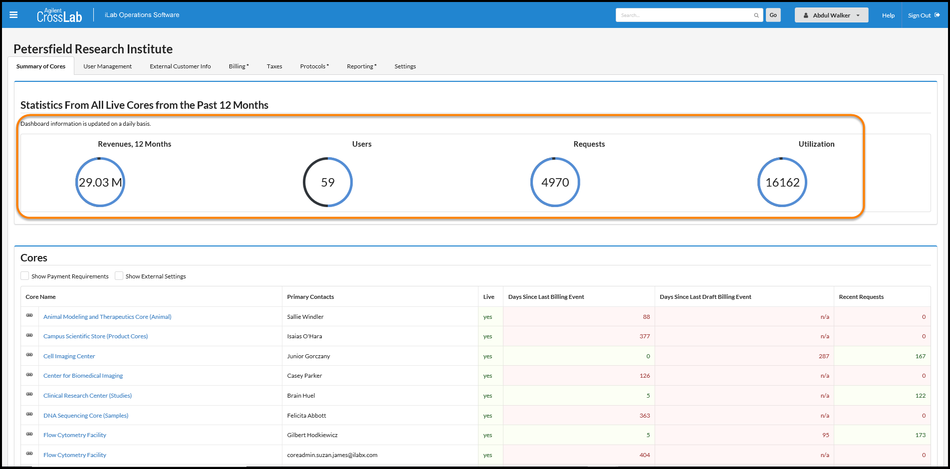 The first section contains the statistics from all of your live cores. The statistics displayed are revenues (for the last 12 months), total users, total requests, and utilization (amount of scheduled time). The light blue indicates users internal to your institution and the dark blue indicates external users.