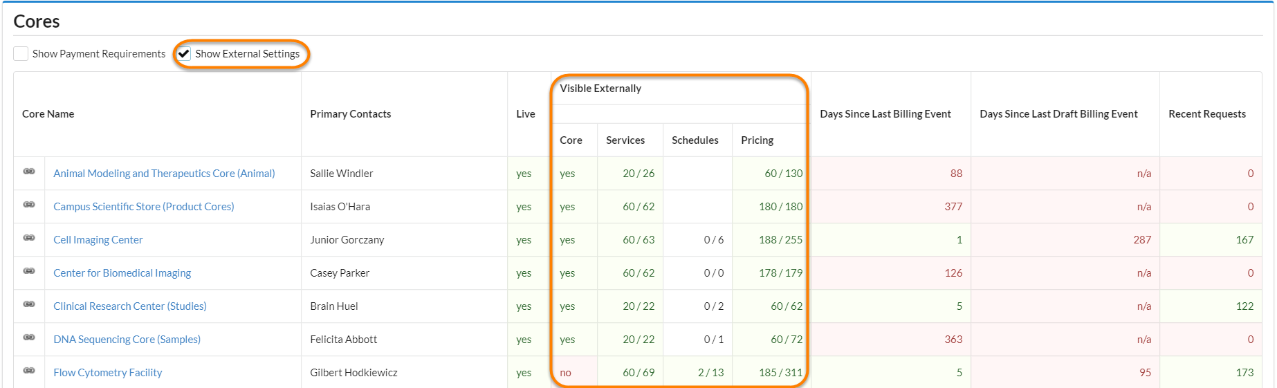 Show External Settings will display the Visible Externally settings used to define how your core will be viewed for external (non-member) iLab customers.