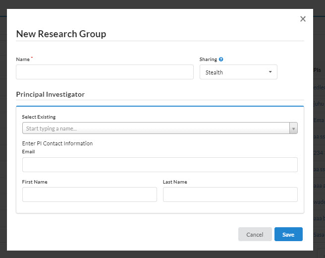Now you will need to designate a PI. If you would like to assign an existing PI, begin typing the name in the Select Existing box and select the appropriate name as it displays below your search. To designate a new PI, enter the email, and first and last name of the new PI, click Save. Your new research group has been added and is ready to use. If lab administrators/managers and/or lab members/users need to be added to the lab this can be done from the Members tab on the group's page.