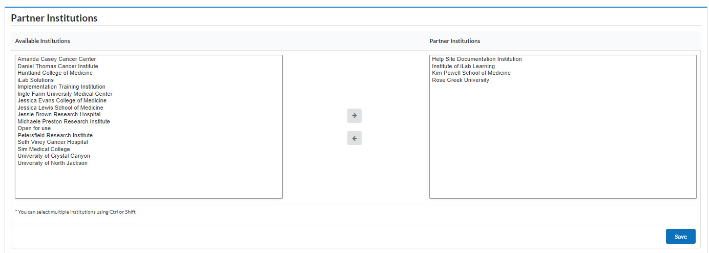Institutions available for partnering display on the left. Institutions you are already partnered with, display on the right. To add a partner institution, highlight it on the left side, and then click the right arrow to move it to the right side. To remove a partner institution, highlight it on the right side and move it to the left. To highlight multiple institutions at once, press the CTRL key while clicking the mouse.