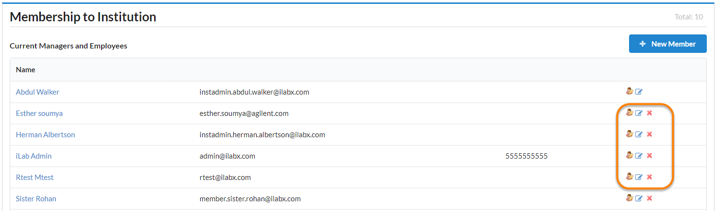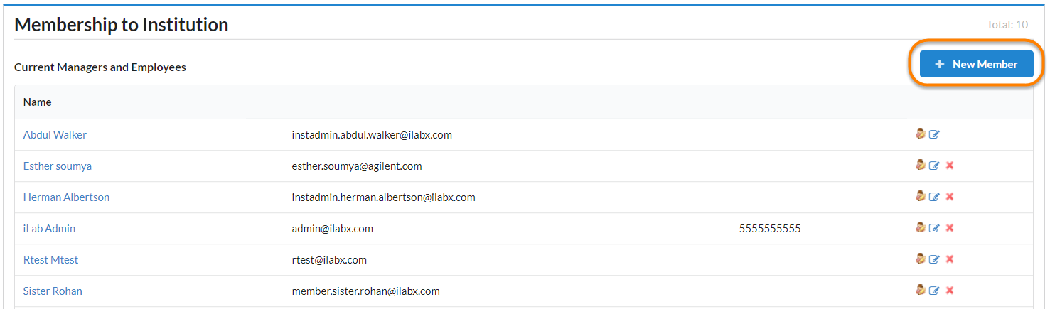 Institution administrators can view and manage the members of their institution here. To add a new member, click the New Member button.