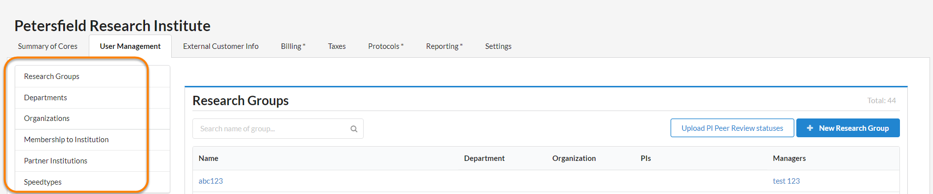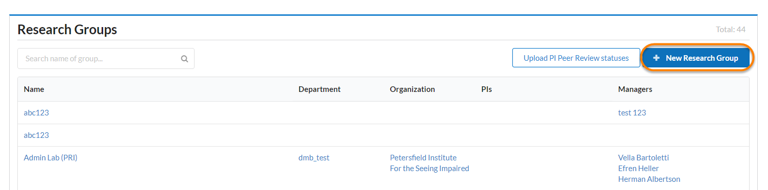 A research group is a lab consisting of a Principle Investigator (PI), lab administrators and lab members. The research groups section will list all internal labs at the institution. To view details about each research group, click on the hyperlinked name. More information can be found in the Overview of Managing a Group section. To add a new research group to your institution, click on the New Research Group button.