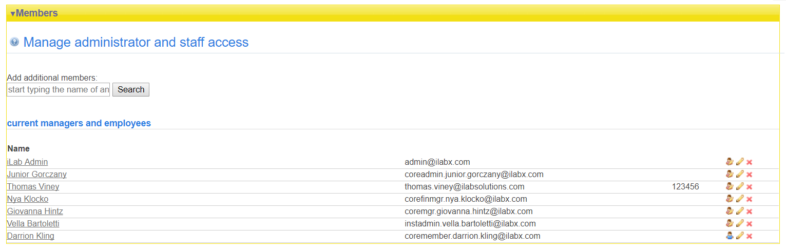 The Members Panel is a list of all core or administration staff who have access to manage your core. The Members panel is accessed through the Administration tab. From the Members Panel, you may add new members to your core, view and edit the role of existing members, edit member profile details, or delete current members.