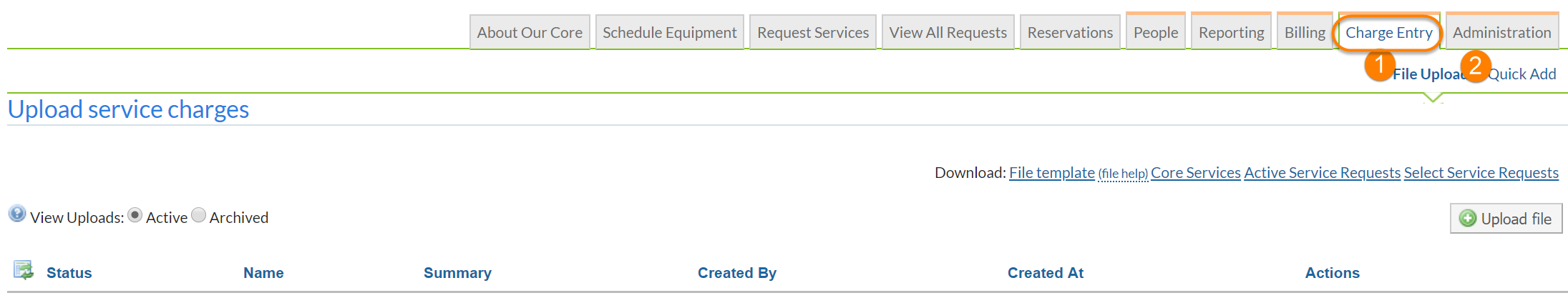 The Charge Entry tool provides a method for directly adding charges to iLab, without using the typical Service Request or other workflows. Charge Entry offers two options: a File Upload to process batches of charges and a Quick Add option to manually add charges. Both are accessible from the Charge Entry tab from your core's homepage.
