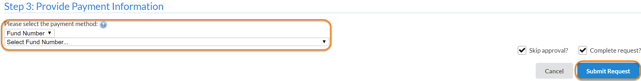 Next, select the Payment Method for the new request. Indicate if you want to skip financial approvals (if this option is enabled for your institution) and if you want to mark the charges on this request as completed. Finally, click Submit Request to finalize the service request and added charges.