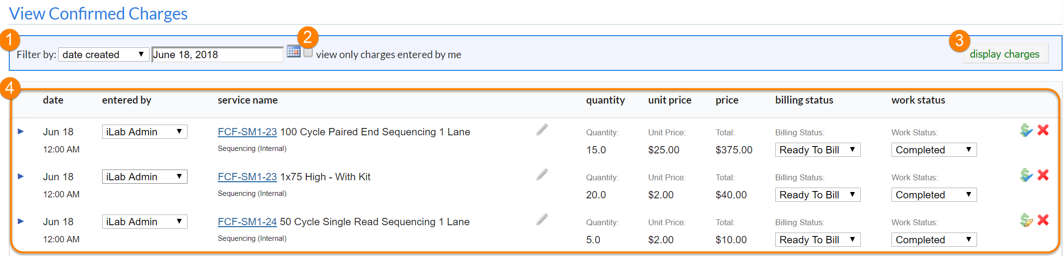 - View only charges entered by me: Toggle if you want to charges entered by all users, or only ones you created. Again, click display charges (item 3) to update.