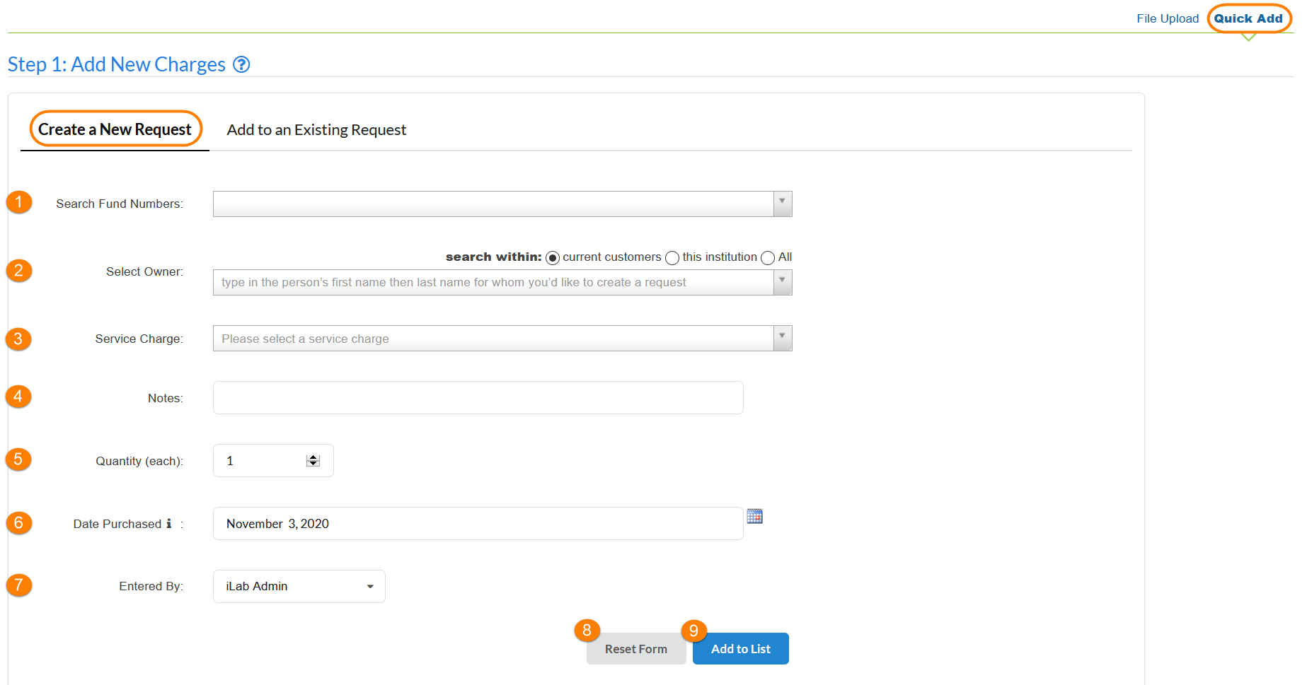 There are two ways of adding charges using Quick Add: adding them to a new request or adding them to an existing request.
