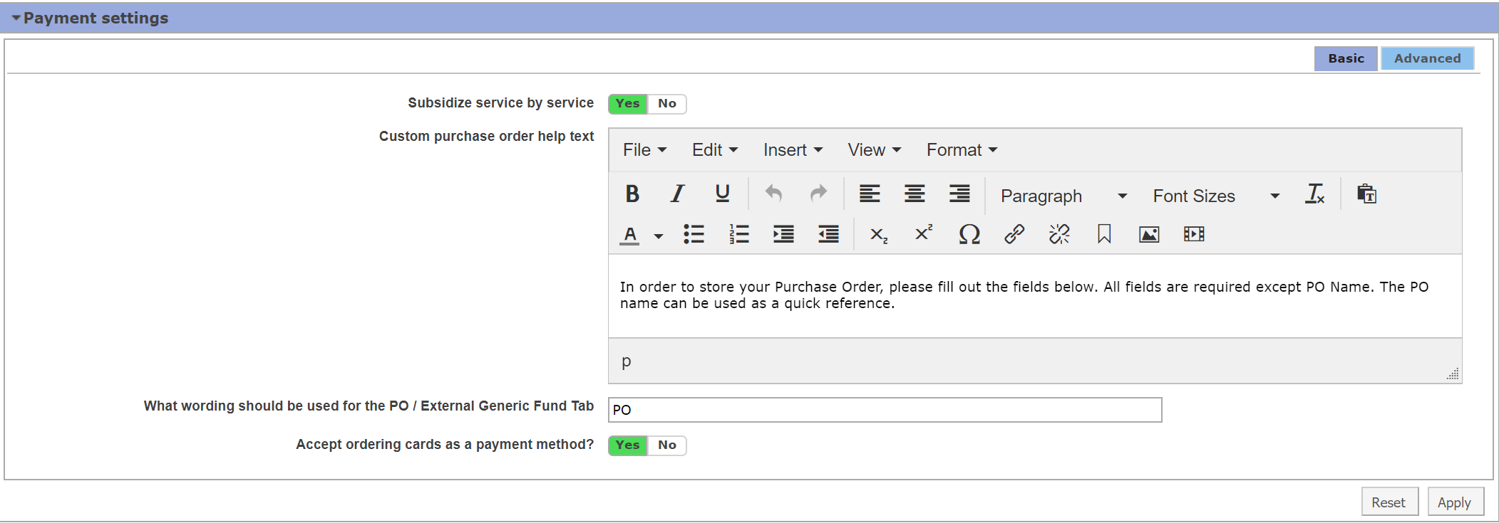 - What wording should be used for the PO/External Generic Fund Tab: When external standing purchase order functionality is enabled, you can indicate what you would like to call your PO/External Generic Fund tab. In the example above, we have entered "PO".