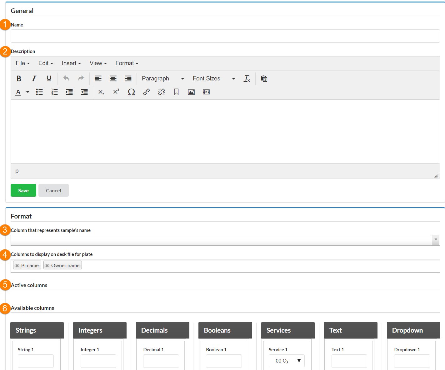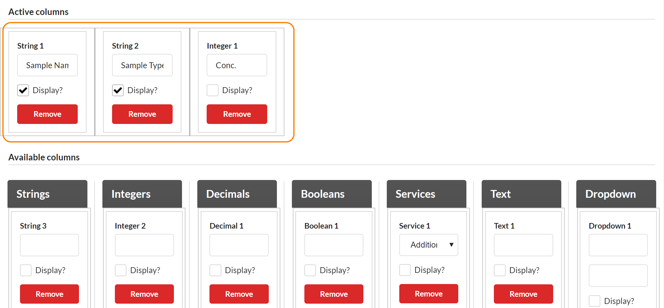 - Active columns: This field lists all the columns you have created for your form. To populate this field, put your cursor on the box header (i.e. "String 1", "Integer 2", etc.), click, and drag the item into the Active Columns section, and arrange them in the order you would like them to display in the request form.
