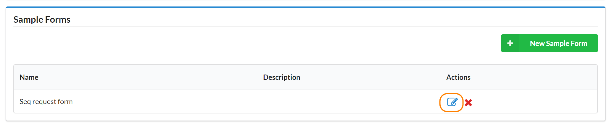 You may also edit an existing sample request form. While on the Administration tab, go to the Sample Forms section, find the form you would like to edit, and click the edit icon located in the Actions column.