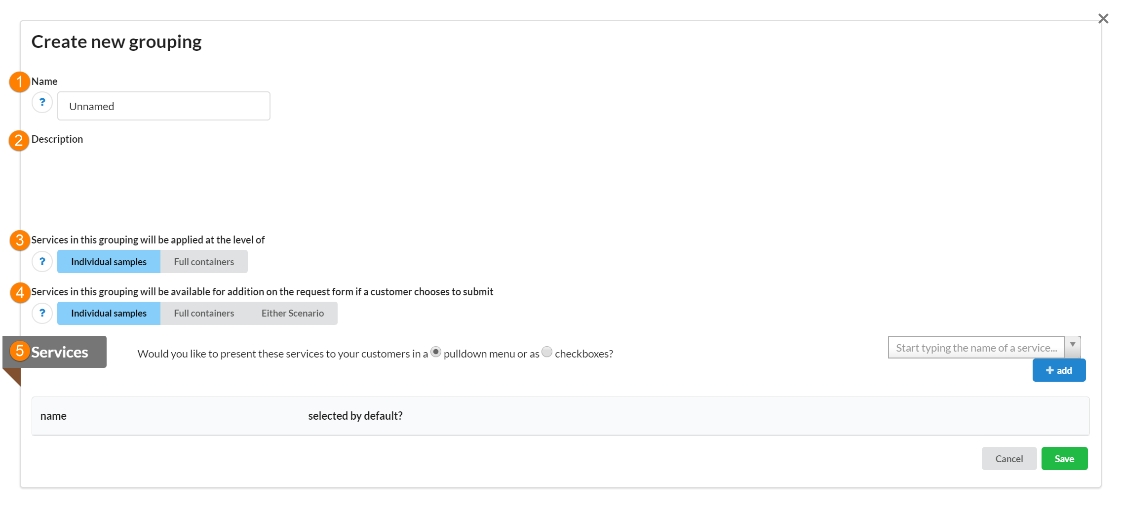 - Services in this grouping will be applied to: Services, or charges, in this grouping will be applied either at the individual sample level or on an entire container.