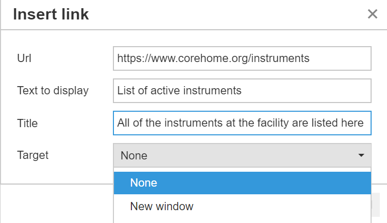- Target: Can either be "None" (the link opens in the current window, i.e. replacing the iLab window) or "New Window" (the link opens in a new window or tab, leaving the iLab window in tact).