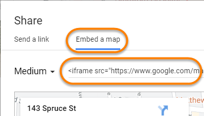 Once on Google Maps' website, search for the directions, map, or Street View image you want to add to your Core page. Click on 'Menu' icon, then on 'Share or embed map'.